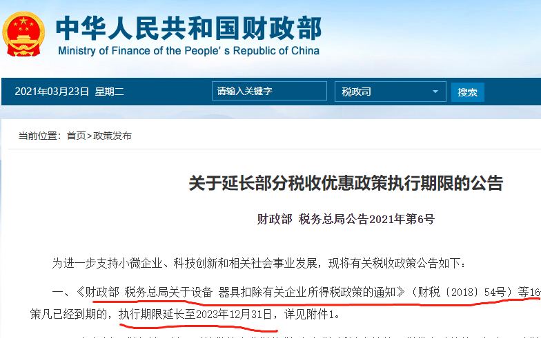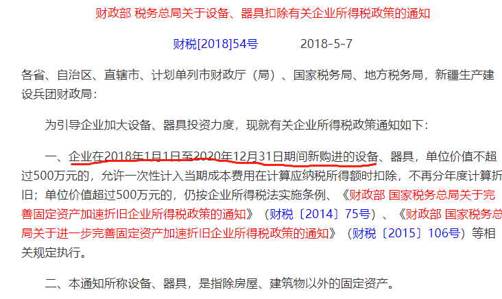 财政部官网公布了部分税收优惠政策延期的公告,其中一个就是大家非常关心的单位价值不超过500万元的设备、器具,允许一次性计入当期成本费用在计算应纳税所得额时扣除的优惠。
