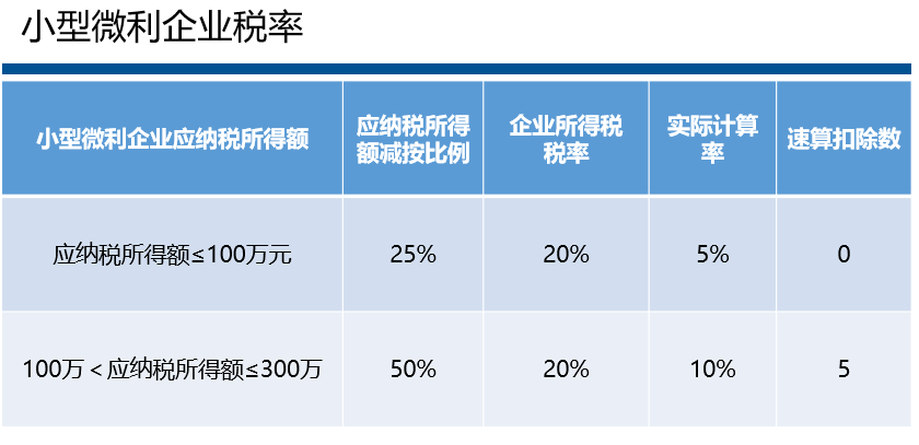 对小型微利企业来说,如果年应纳税所得额100万以内,由实际税负率5%降至2.5%。