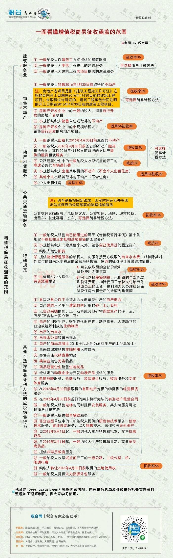 增值税计税方法包括一般计税方法和简易计税方法。当可抵扣的进项税额较少时,一般情况下选择简易计税更节税。43种情形可以适用简易计税,具体请看导图: